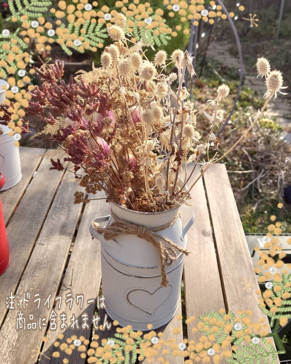 ブリキ素材ですので、長期間の使用により変色が見られることがあります。特に屋外で使用する際には、管理にご注意ください。また、植物や小物によっては、定期的なメンテナンスが必要になる場合がございます。